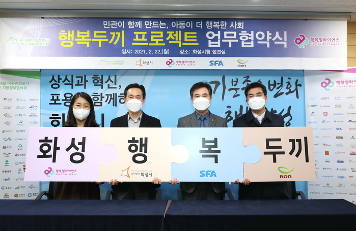 경기 화성시가 지난 22일 행복얼라이언스 및 에스에프에이·본아이에프와 ‘행복두끼 프로젝트’ 업무협약을 맺었다. 협약에 따라 지역내 결식아동 100여명에게 6개월간 1주일 5식 기준 총 132일치의 도시락이 제공된다. 사진은 협약식에서 서철모 시장(오른쪽 두 번째)이 관계자들과 '화성 행복두끼' 팻말을 들고 기념촬영을 하는 모습. (사진제공=화성시청)