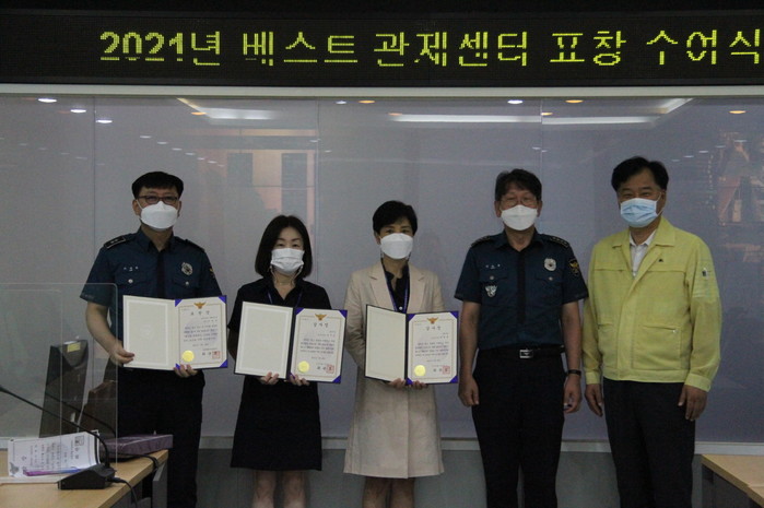 서울 금천구는 2021년 상반기 서울시 자치구 25곳 CCTV관제센터에 대한 서울지방경찰청 평가에서 ‘베스트 관제센터 2위’에 선정돼 최근 금천경찰서장이 관제요원 2명과 경찰관 1명에게 감사장과 표창장을 전달했다. 사진은 금천구 U-통합운영센터에서 관제요원과 경찰관계자가 감사장과 표창장을 전달받은 후 기념촬영을 하고 있는 모습. (사진제공=금천구청)