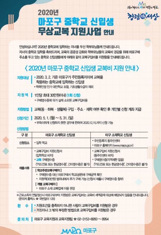 [시민일보 = 홍덕표 기자] 서울 마포구(구청장 유동균)가 구에 거주하는 2020학년도 중학교 신입생들에게 교복구입비를 지원한다.