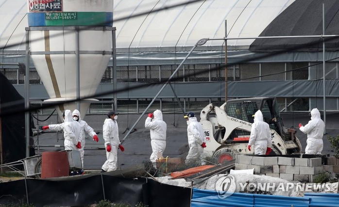 11일 전남 장성의 한 오리농장에서 조류인플루엔자(AI) 검출로 인해 방역 당국 관계자들이 살처분 작업을 하고 있다.