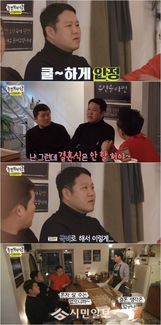 순순히 인정한 김구라에 박명수는 “그건 좋아. 나도 박수 보내. 혼자 사는 것 보다 같이 사는 게”라며 응원했고, 김구라는 “우리가 또 장래를 예측할 수 없기 때문에. 섣불리 이 나이에 뭘 얘기하기는 그렇다. 뭔가 결심히 섰을 때 얘기하겠다”고 조심스러운 모습을 보였다.