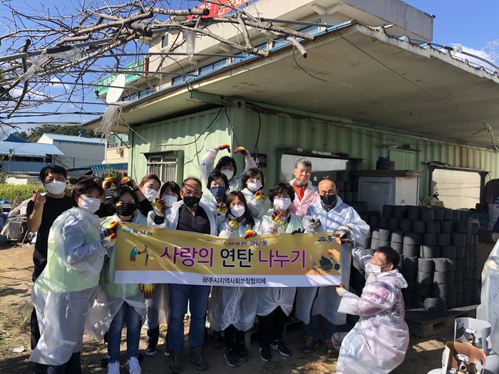 경기 광주시 광남동 지역사회보장협의체는 최근 장지동 '육소식당'에서 기부한 연탄 500장을 지역내 저소득 가구에 배달했다. 사진은 이날 행사에 참여한 협의체 위원들이 연탄을 배달한 후 기념촬영을 하는 모습. (사진제공=광주시청)