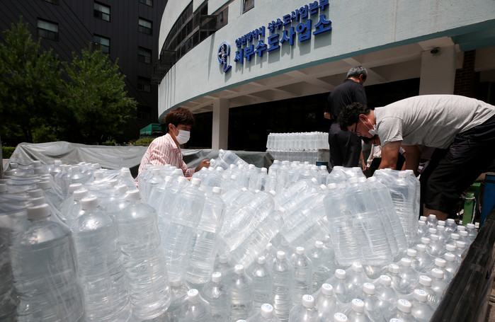 15일 오후 인천 서구 서부수도사업소 주차장에서 사업소 직원들이 병입수돗물인 미추홀참물을 운송 트럭에 싣고 있다.