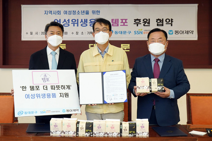 서울 동대문구와 동아제약·동대문구사회복지협의회가 19일 지역아동센터 이용 저소득 여성청소년에게 위생용품을 지원하기 위해 1년간 후원 사업협약을 체결했다. 지원되는 위생용품(템포)은 2800여개 상자로 여성청소년 116명이 1년 동안 사용할 수 있는 분량이다. 사진은 협약식에서 최홍연 부구청장(가운데)과 관계자들이 기념촬영을 하는 모습. (사진제공=동대문구청)
