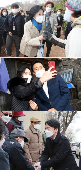 휴일인 28 서울시장 보궐선거에 출마하는 더불어민주당 박영선 후보(왼쪽부터) 국민의힘 오세훈 후보, 국민의당 안철수 후보가 시민들을 만나 인사하고 있다. 민주당 박영선 후보는 오전 중구 ‘한양도성 순성길’을, 국민의힘 오세훈 후보는 마포구 경의선숲길을, 국민의당 안철수 후보는 금천구 재건축 추진 아파트를 방문했다.