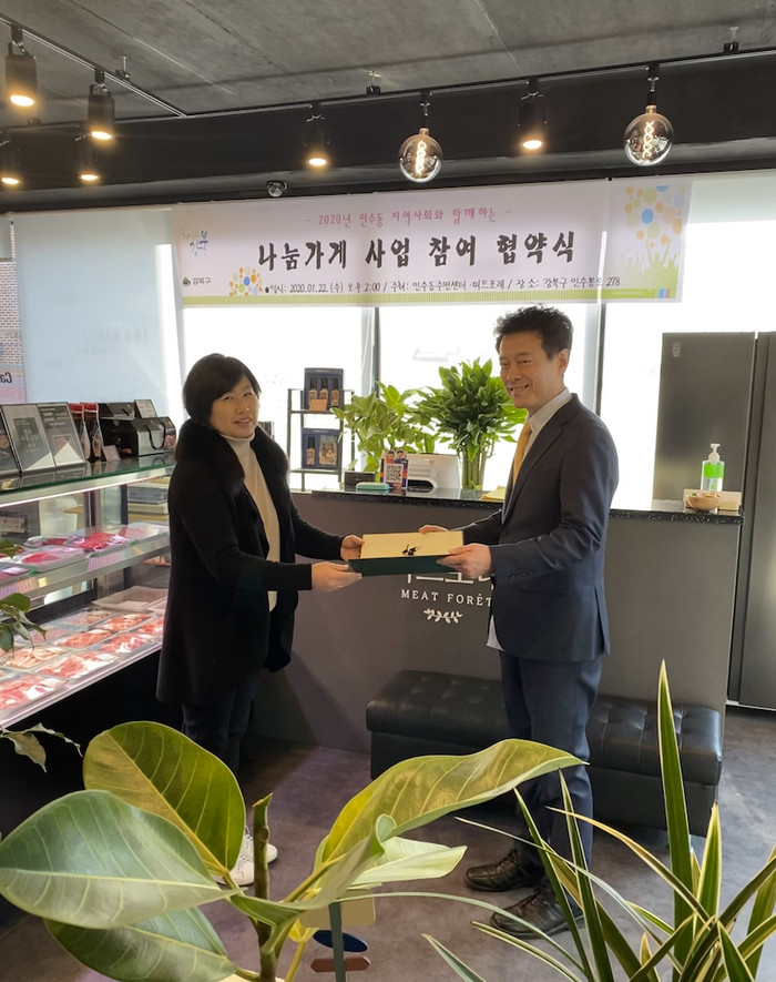 ▲ 지난 1월22일 인수동 주민센터와 지역내 미트포레의 나눔가게 사업 참여 협약식. (사진제공=강북구청) |