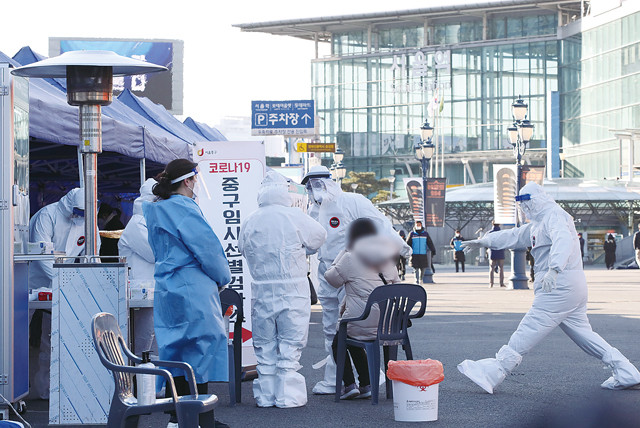 14일 오전 서울 중구 봉래동 서울역 앞에 마련된 코로나19 임시 선별검사소에서 시민들이 검사를 받고 있다.