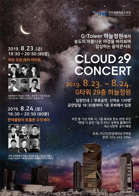 ‘CLOUD 29 CONCERT’는 인천경제청이 송도를 찾는 내·외국인과 지역 주민들에게 고품격 문화서비스를 제공하기 위해 2014년부터 개최하고 있는 문화행사다. 29층 야외 무대에서 송도의 멋진 야경과 함께 음악 공연을 관람하는 색다른 경험을 할 수 있다.
