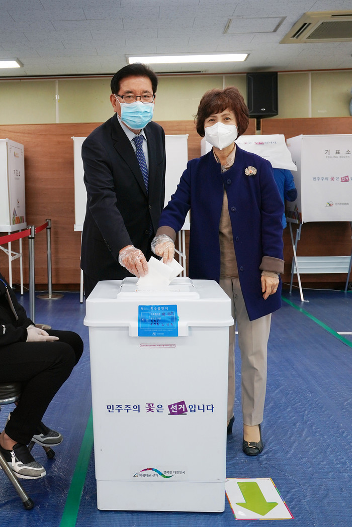유덕열 서울 동대문구청장이 ‘제21대 국회의원 선거’ 사전투표를 위해 10일 9시 부인 정승교씨(세명대학교 교수)와 함께 답십리2동 주민센터 4층에 설치된 사전투표소를 방문, 투표에 참여했다. 사진은 투표함에 투표용지를 넣고 있는 유 구청장(왼쪽)과 정씨의 모습.(사진제공=동대문구청)