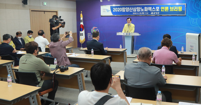 함양군 서춘수 군수는 25일 오전 군청 소회의실에서 기자회견을 갖고 “국내외 코로나19의 확산 상황과 지속 가능성으로 인해 오는 9월 개최 예정이었던 2020 함양산삼항노화엑스포를 내년 하반기로 연기하기로 최종 결정하였다”고 밝혔다.