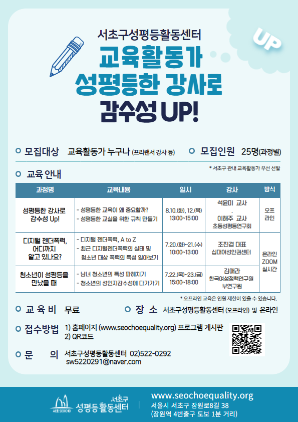 교육활동가들의 성인지감수성을 높이고 성평등한 교육환경 조성을 위해 마련된 이번 교육은 프리랜서 강사 및 방과후 교사 등 지역에서 개별적으로 활동하고 있는 교육활동가 모두 신청 가능하며, 과정별 선착순 25명을 모집한다.