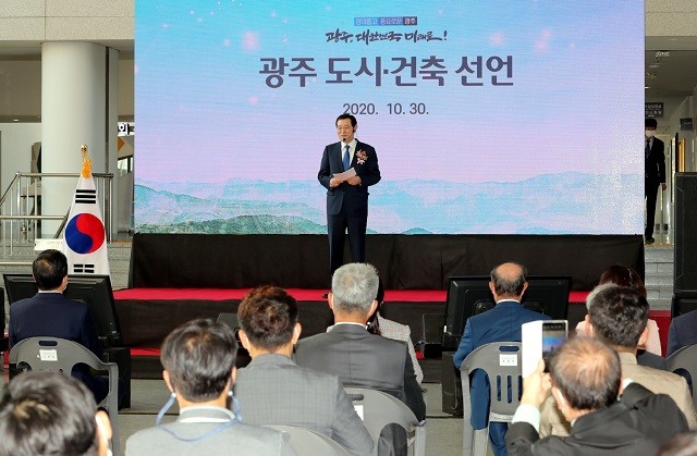| ▲ 이용섭 광주광역시장이 30일 오후 시청 시민홀에서 열린 광주 도시·건축 선언 선포식에 참석해 선언문에 담긴 내용을 설명하고 있다./광주광역시 제공 |