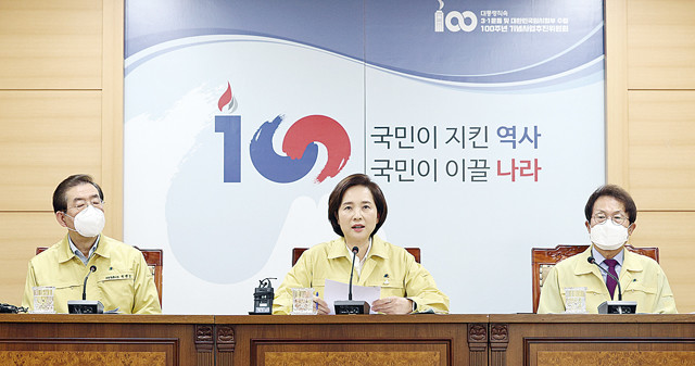 유은혜 사회부총리 겸 교육부 장관이 14일 오전 서울 종로구 정부서울청사에서 열린 ‘학원 등 다중이용시설 방역 강화를 위한 교육부·서울시·서울시교육청 긴급회의’에서 발언을 하고 있다. 왼쪽부터 박원순 서울시장, 유 부총리, 조희연 서울시 교육감.