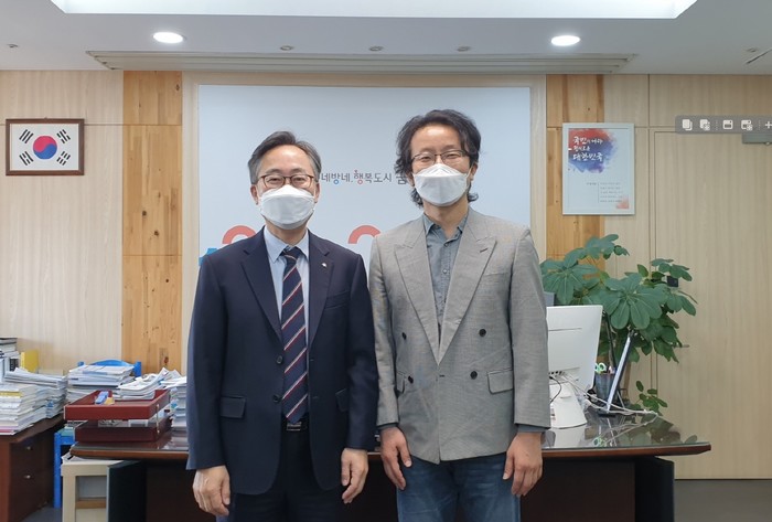 서울 금천구는 지난 20일 제1회 금천패션영화제 집행위원장에 정윤철 영화감독을 위촉했다. 금천패션영화제는 서울 서남권 지역의 패션산업 중심지인 금천구를 기반으로 하는 문화 축제다. 사진은 위촉식에서 유성훈 구청장(왼쪽)과 정 강독이 기념촬영을 하는 모습. (사진제공=금천구청)