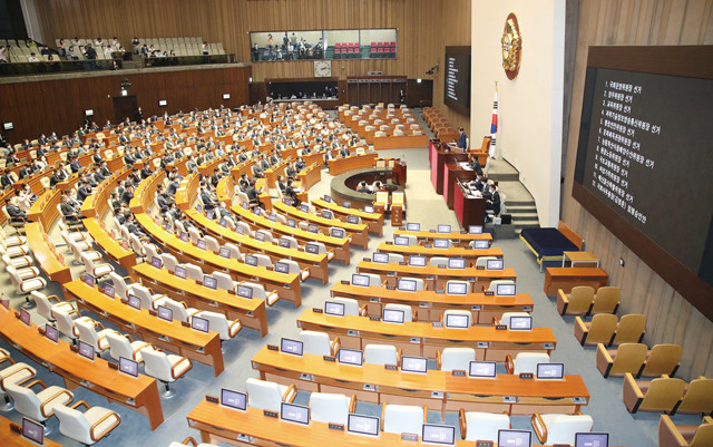 29일 오후 국회 본회의가 미래통합당 의원들의 불참 속에 진행되고 있다. 박병석 국회의장은 본회의 개의하면서 “국민과 기업의 절박한 호소를 더 외면할 수 없어 오늘 원 구성을 마치기로 했다”고 말했다.