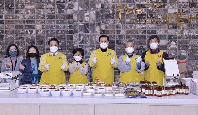 | ▲ 이용섭 광주광역시장이 3일 오후 동구 ㈔자비신행회에서 열린 '청년 행복도시락' 만들기 봉사활동에 참여해 임택 동구청장, 자원봉사자 등과 도시락을 만든 뒤 기념촬영을 하고 있다./광주광역시 제공 |