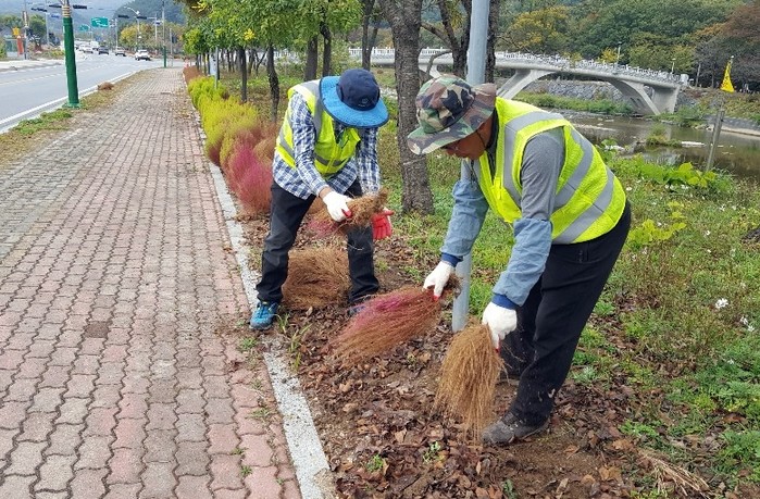 군은 엑스포 주요 도로변에 식재된 코키아가 10월부터 붉게 변하기 시작하여 20여일이 지난 현재 일부 구간부터 생육주기 중 마지막 단계인 갈색으로 변함에 따라 그동안 잡초 억제를 위하여 피복된 비닐을 벗기고 갈색으로 변한 코키아의 씨앗을 채취하고 다시 파종 후 꽃대를 제거하여 내년도에 자연 발아될 수 있는 여건을 만들어 가고 있다.
