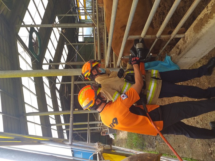 축사 주인의 신고로 출동한 119구조대는 흥분한 소를 진정시키기 위해 모포로 소의 눈을 가린 후 유압절단기로 울타리를 절단하여 소를 안전하게 구조했다.
