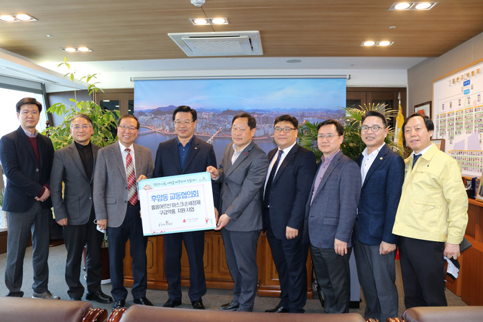 서울 용산구 후암동 교동협의회가 25일 용산복지재단에 마스크 등 코로나19 예방 물품을 기부했다. 물품은 동주민센터를 통해 지역내 홀몸노인 200가구에 전달된다. 사진은 물품 전달 후 성장현 구청장(왼쪽에서 네 번째)과 회원들의 기념촬영 모습. (사진제공=용산구청)