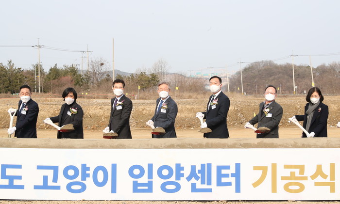 경기 화성시 마도면 화옹간척지 제4공구 일원에서 9일 ‘경기도 고양이 입양센터’ 기공식이 개최됐다. 고양이 입양센터는 오는 12월까지 부지 4만7419㎡·건축 연면적 892㎡ 규모로 총 150마리가 수용 가능한 보호시설 등을 갖출 예정이다. 사진은 기공식에서 서철모 시장(왼쪽 세 번째)와 이재명 경기도지사 및 관계자들이 시삽을 하고 있는 모습. (사진제공=화성시청)
