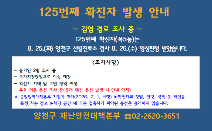 양천124번 확진자 B씨(신정3동 거주)는 양천121번의 동거인으로, 기침 증상이 발생해 검사를 받았으며, 양천125번 C씨(목5동 거주)는 발열 증상이 발생해 검사를 받았으나, 감염 원인은 현재 조사 중이다.