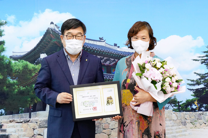 경기 광주시는 최근 지역사회보장협의체 활성화에 기여한 공로로 최순자씨에게 유공자 표창을 수여했다. 최씨는 오포읍 지역사회보장협의체 위원으로 활동하면서 복지사각지대 발굴 등 복지 향상에 기여한 점을 인정받았다. 사진은 시상식에서 신동헌 시장(왼쪽)이 최씨와 기념촬영을 하는 모습. (사진제공=광주시청)