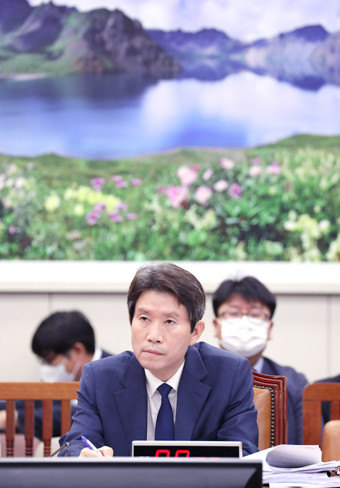 이인영 통일부 장관 후보자가 23일 오후 서울 여의도 국회에서 열린 외교통일위원회 인사청문회에서 미래통합당 김석기 의원으로부터 질문을 받고 있다.