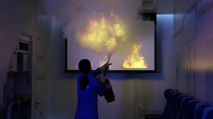 | ▲기내화재 발생시 필요한 조치에 대해 실습하고 있다.. |