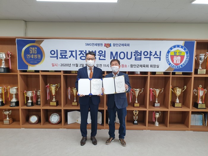 함안군체육회(회장 정병옥)는 지난 2일 오전 함안군체육회 사무실에서 SMG연세병원(병원장 김정환)과 함안군체육인의 건강증진과 체육발전을 위한 업무협약을 체결했다.