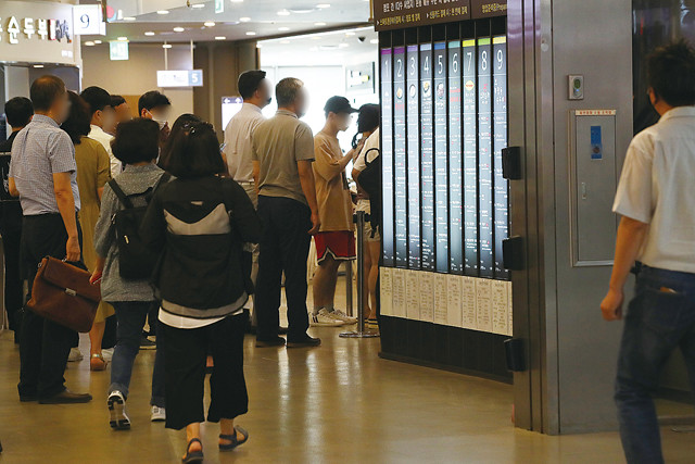 수도권 전지역에 사회적 거리두기 2단계가 시행 중인 20일 점심시간 서울역 푸드코트에서 이용객들이 음식 주문을 위해 줄을 서 있다.