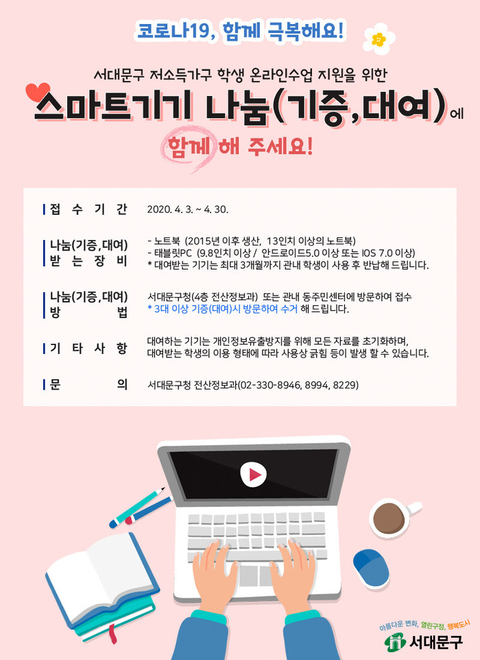 [시민일보 = 홍덕표 기자] 서울 서대문구(구청장 문석진)가 코로나19로 인한 온라인 개학에 대비해 지역사회가 자발적으로 참여하는 '스마트기기 나눔'을 추진한다.