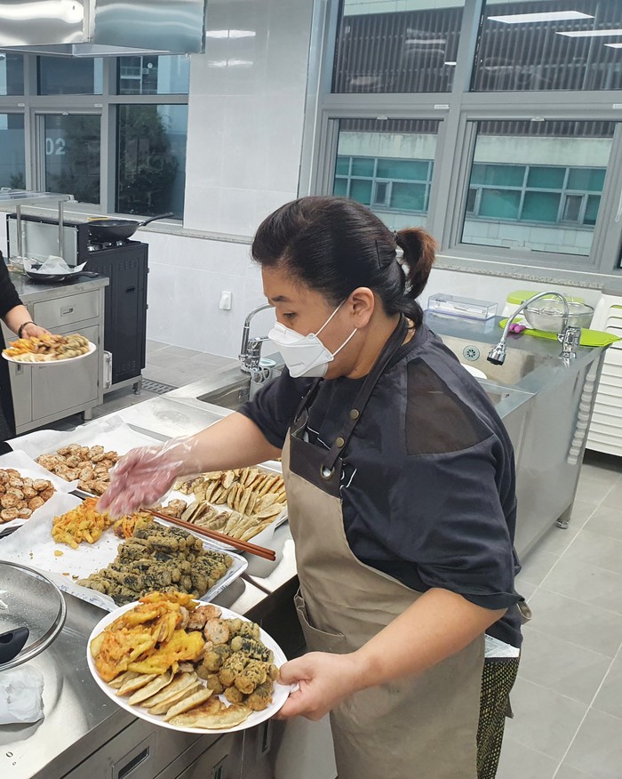 경기 남양주시 퇴계원주민자치위원회는 아이스팩 수거 자원봉사자와 관련 직원들을 격려하기 위해 최근 이틀에 걸쳐 전통전·만두 등을 준비해 전달하며 노고를 격려했다. 사진은 위원들이 전통전을 만들고 있는 모습. (사진제공=남양주시청)
