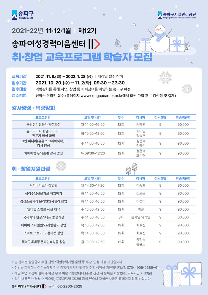 [시민일보 = 이대우 기자] 서울 송파구시설관리공단 소속 송파여성경력이음센터(이하 센터)는 오는 11월부터 경력단절여성을 위한 취 ‧ 창업 교육프로그램을 진행한다.