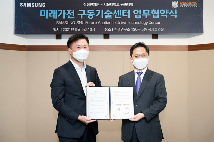 삼성전자와 서울대는 지난 9일 서울 관악구 소재 서울대 전력연구소에서 이기수 삼성전자 생활가전사업부 부사장, 이병호 서울대 공과대학장 등이 참석한 가운데 ‘미래가전 구동기술센터(센터장 하정익 교수)’ 설립을 위한 업무협약(MOU)을 체결했다.