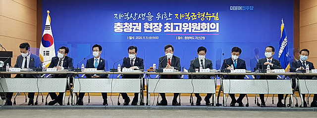 이낙연 대표(왼쪽에서 다섯 번째)를 비롯한 더불어민주당 지도부가 11일 오전 충북 괴산군청에서 ‘지역 상생을 위한 지역 균형 뉴딜 충청권 현장 최고위원회’를 열어 지역 현안을 논의하고 있다.