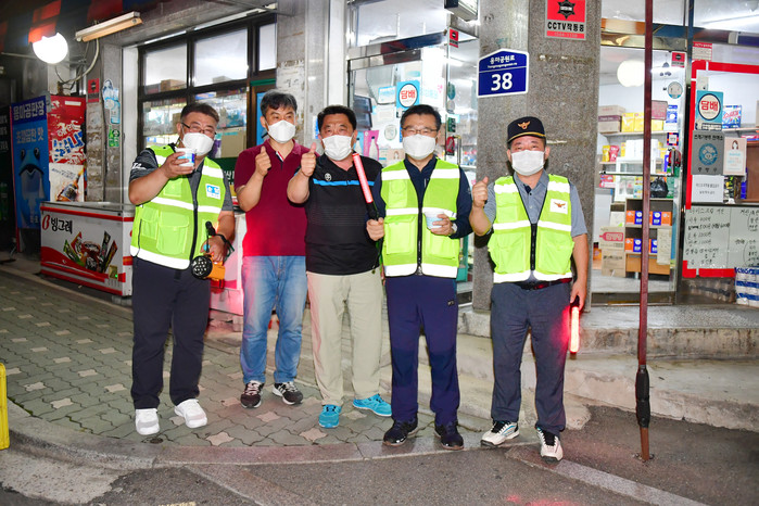 류경기 중랑구청장이 19일 오후 8시 공무원, 망우3동 자율방범대원들과 함께 망우3동 인근의 학교와 공원 인근을 돌며 민관합동 야간순찰 활동을 진행했다. 사진은 류 구청장(오른쪽 두 번째)이 참여자들과 기념촬영을 하는 모습. (사진제공=중랑구청)