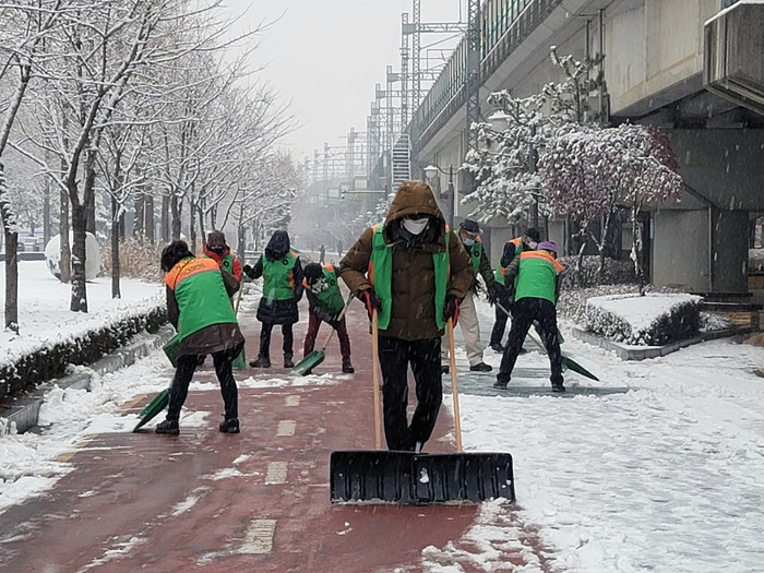 경기 동두천시 지역자율방재단이 지난 13일 눈으로 인한 안전사고 예방과 시민들의 불편을 최소화하기 위해 긴급제설작업을 펼쳤다. 사진은 봉사자들이 전철하부 인도 및 자전거도로와 신시가지 주요도로 등 약 3km 구간의 쌓인 눈을 제거하고 있는 모습. (사진제공=동두천시청)