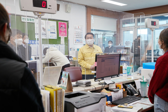 오세현 충남 아산시장이 신축년 새해를 맞아 11~16일 지역내 17개 읍·면·동 행정복지센터를 방문하며 지난해 코로나19 방역활동과 긴급생활안정자금 지원사업 신청 접수 등 최일선에서 어느 때보다 수고가 많았던 직원들의 노고를 격려한다. 사진은 오 시장이 직원들을 격려하는 모습. (사진제공=아산시청)
