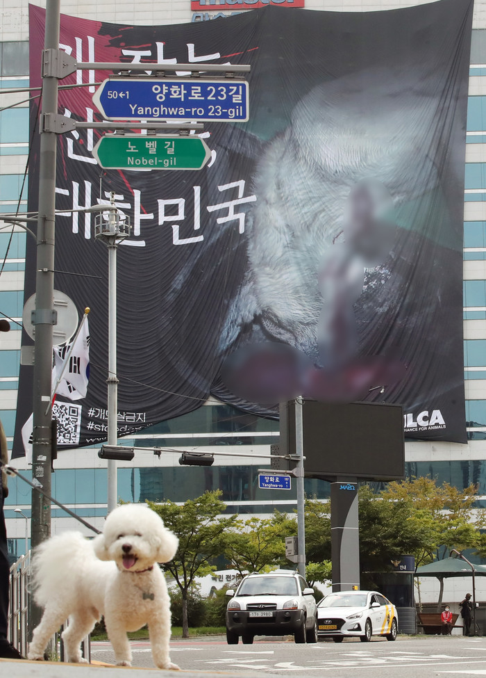 5일 서울 마포구 동교동 로터리 한 빌딩에 동물보호단체인 '동물해방물결'이 내건 개 식용 금지 대형 현수막이 보인다.