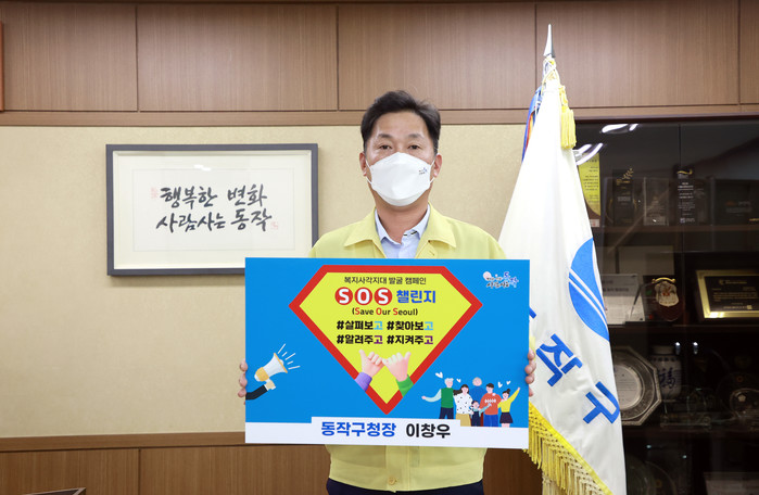 이창우 서울 동작구청장이 최근 아동학대 및 사회적 약자를 향한 학대와 폭력으로부터 보호하고 복지사각지대 해소를 목적으로 펼치는 SNS 캠페인 ‘SOS(Save Our Seoul) 릴레이 챌린지’에 동참했다. 사진은 이 구청장이 SOS 릴레이 챌린지에 참여하고 있는 모습. (사진제공=동작구청)