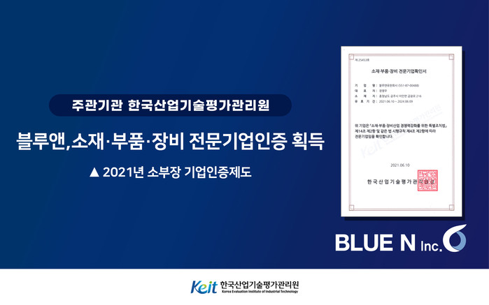 소재˙부품˙장비 전문기업 인증을 획득한 블루앤 유한회사는 이후 산업기능요원제도, 사업화 및 경영지원, 기술지원 및 기술개발 등 소재부품장비산업 분야 성장을 위한 전반적인 지원사업 혜택을 받게 된다.