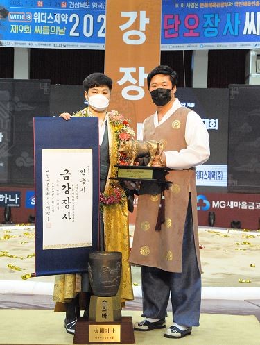 특히, 전날 개최된 예선전 16강에서 발목부상을 딛고 투혼을 발휘하는 등 개인통산 11번째 금강장사에 올라 금강급에서는 타의 추종을 불허하고 있다.