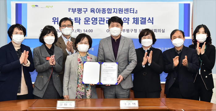 인천 부평구가 7일 재단법인 인천시 사회서비스원과 구 육아종합지원센터 운영 위·수탁 계약을 체결했다. 이날 계약에 따라 사회서비스원은 오는 2월부터 2026년 1월 말까지 5년간 센터의 전반적인 운영과 관리를 전담한다. 사진은 차준택 구청장(오른쪽 네 번째)이 계약 체결 후 관계자들과 기념촬영을 하는 모습. (사진제공=인천 부평구청)