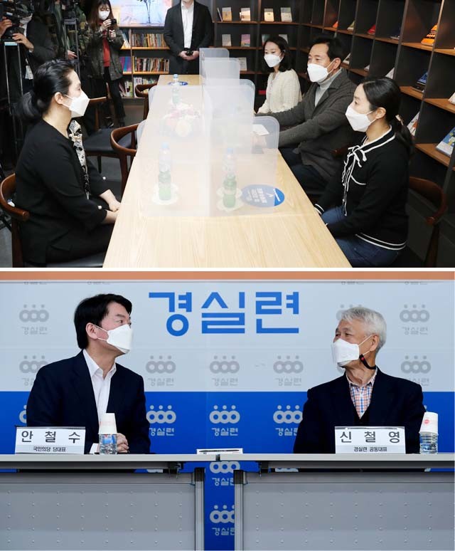 국민의힘 오세훈 서울시장 후보가 22일 오후 서울 서초구 서초4동 주민센터에서 공유어린이집 관계자와 간담회를 하고 있다. 국민의당 안철수 서울시장 후보(왼쪽)와 신철영 경제정의실천시민연합 공동대표가 22일 서울 종로구 경실련에서 열린 ‘국민의당-경실련 정책협약식’에서 대화하고 있다.