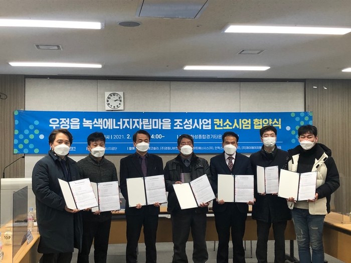 경기 화성시 우정읍이 3일 한국에너지공단·(주)현대에코쏠라·(주)경동나비엔신재생·(주)대성히트에너시스·인픽스테크놀러지(주)·(주)제이에이치에너지와 ‘우정읍 녹색에너지 자립마을 조성 컨소시엄’을 체결했다. 협약을 통해 올해 말까지 우정읍 일원에 녹색에너지 자립마을 인프라를 구축할 계획이다. 사진은 협약식에서 관계자들이 기념촬영을 하는 모습. (사진제공=화성시청)
