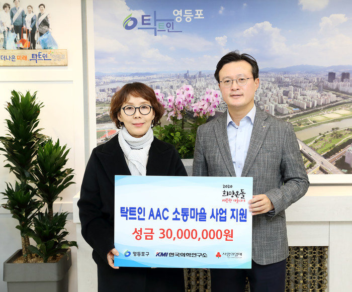 | ▲ 채현일 구청장(오른쪽)이 KMI 한국의학연구소 이사장으로부터 ‘탁트인 AAC 소통마을’ 조성을 위한 성금 3000만원을 기탁받고 기념촬영을 하고 있다. (사진제공=영등포구청) |