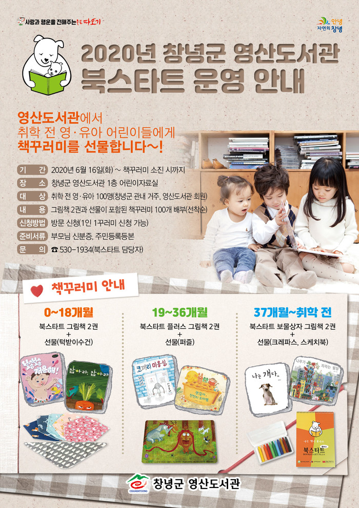 신청대상은 창녕군에 거주하는 취학 전 영유아 어린이 회원이며, 책꾸러미는 영유아 연령대별로 그림책 2권과 턱받이수건(18개월 이하), 퍼즐(36개월 이하), 스케치북과 크레파스(취학 전)로 구성되어 있다.