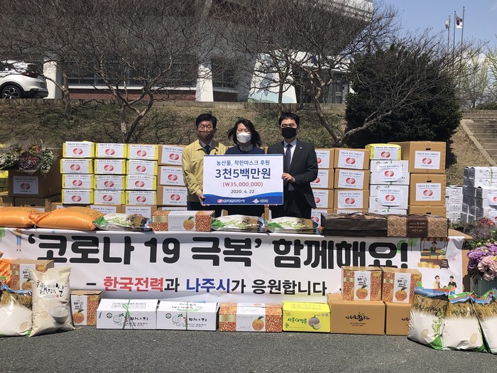 이와 관련해 한전은 22일 나주시와 코로나19로 판로가 막힌 나주시 소재 농가에서 재배한 농특산물 2000만원 어치를 구매하여 복지기관 35곳에 전달하는 '농산물 후원 전달식'을 나주실내체육관에서 가졌다.