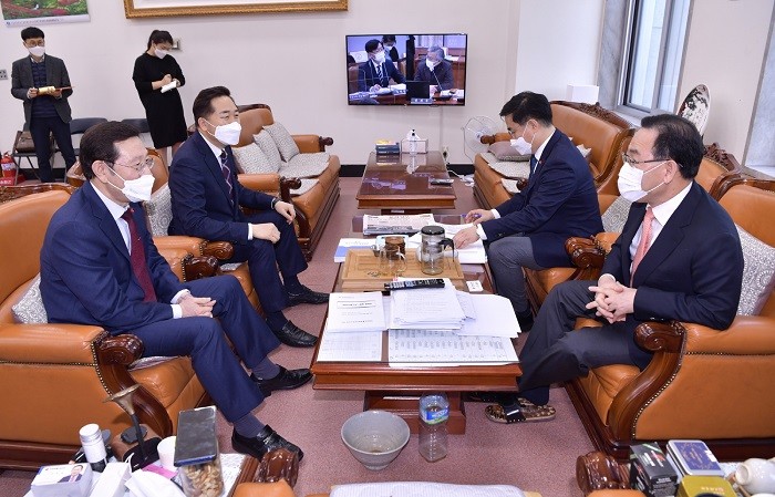 이용섭 광주광역시장은 24일 오후 서울 여의도 국회본청을 방문해 주호영 국민의힘 원내대표와 면담을 갖고 아시아문화중심도시 조성에 관한 특별법(아특법) 개정안이 국회에서 통과되도록 협조해줄 것을 요청했다./광주광역시 제공