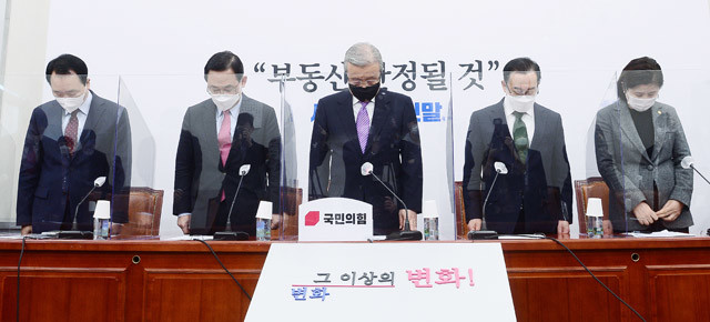 국민의힘 김종인 비상대책위원장을 비롯한 참석자들이 23일 오전 서울 여의도 국회에서 열린 비상대책위원회의에서 2010년 11월 23일 북한의 연평도 포격으로 발생한 해병 전사자 및 민간인 희생자에 대한 묵념을 하고 있다.
